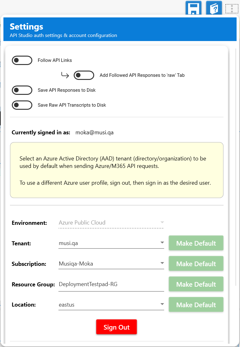 Built-in parameters like subscription id, resource group name, location and tenant id take their default values from the Settings page in API Studio. The Settings page enables setting an account for use in authentication and specifying default values for the subscription id, resource group name and location.