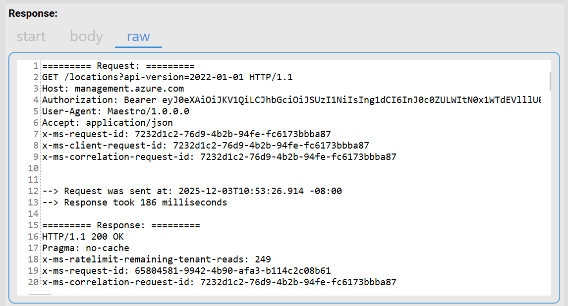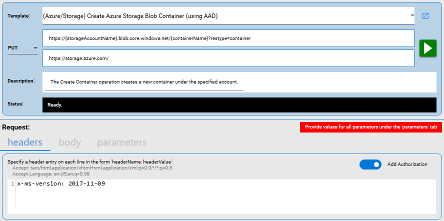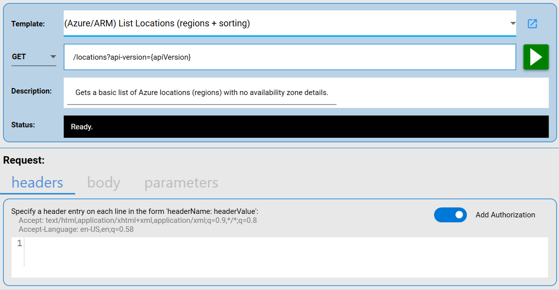 After loading an ARM sample from the built-in templates, like the locations API call shown in the screenshot below, the headers configuration has its Add Authorization toggle button turned ON. This means that API Studio will take care of automatically generating the Bearer token and populating the Authorization header with it.