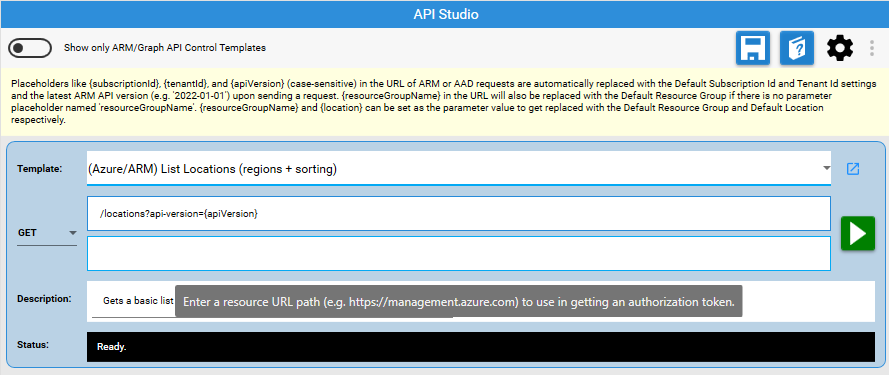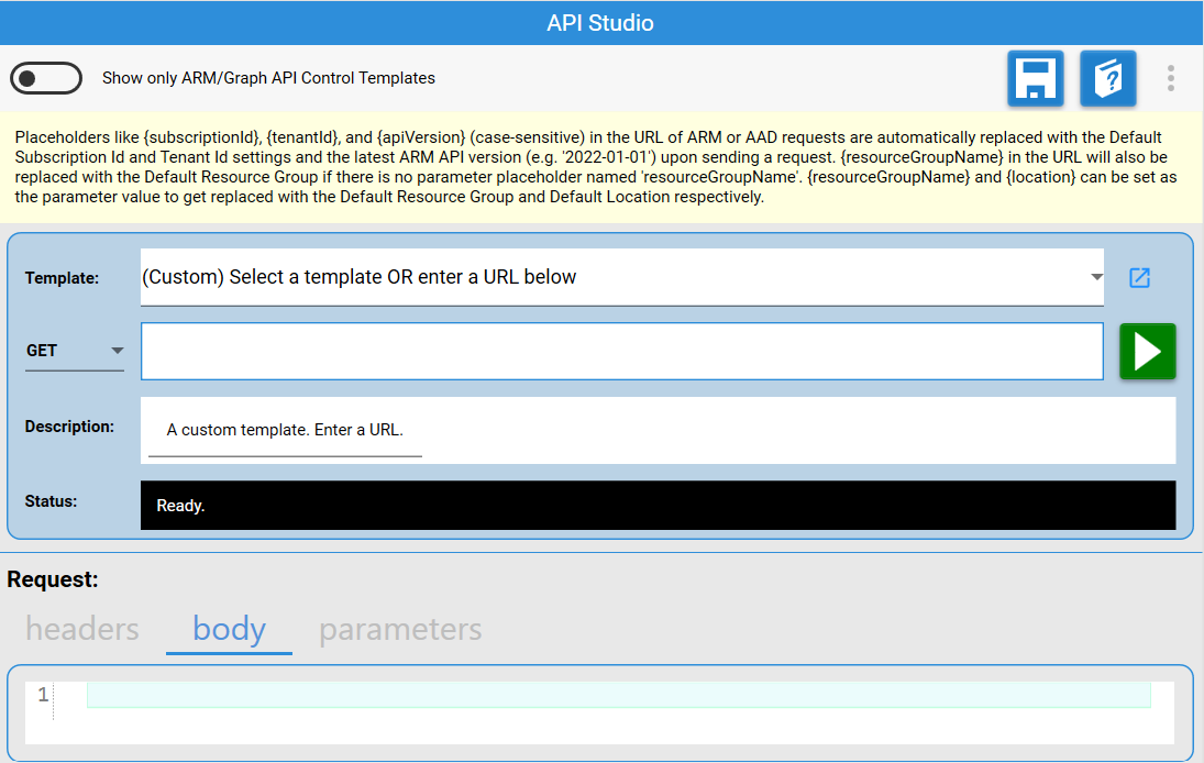 In addition to its standalone use for general-purpose REST API composition and testing—even non-Azure, non-ARM or Graph API scenarios, API Studio has a special mode that allows testing and validating ARM and MS Graph API that are eligible for using in the ArmApiControl and GraphApiControl in UI definition JSON (i.e createUiDefinition.json or uiFormDefinition.json).