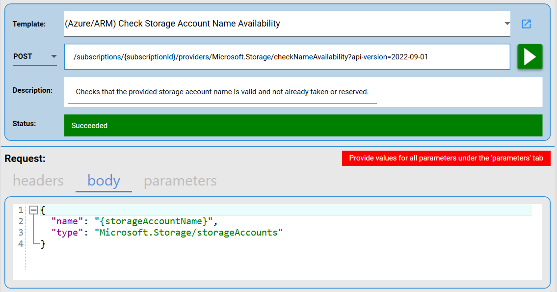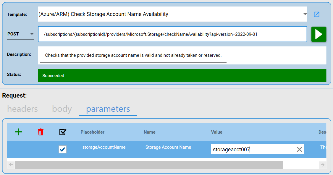 Here's another example of using parameters to specify the values to send in a REST API call, instead of using hard-coded values. In the example below, the location parameter overrides the built-in location parameter. But we could reference the built-in location parameter by setting the value in the grid shown in the screenshot below to "{location}". Notice that parameters can have their own short description and a link to an Azure documentation page listing more details about them.