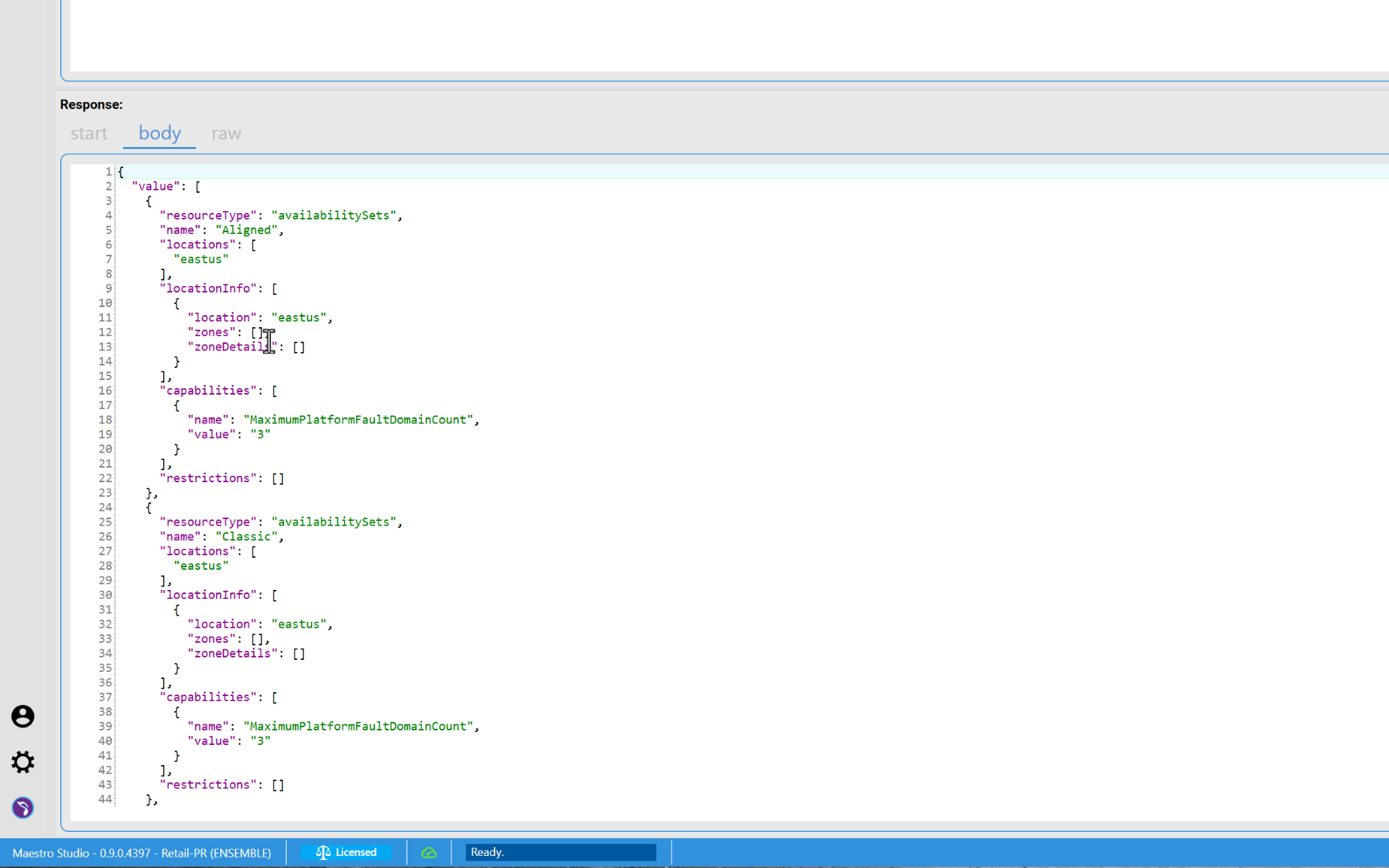 The following screenshot shows the response body for a call to the locations API. It is clear how API Studio has taken care of setting the required headers even though we specified no headers in the request.