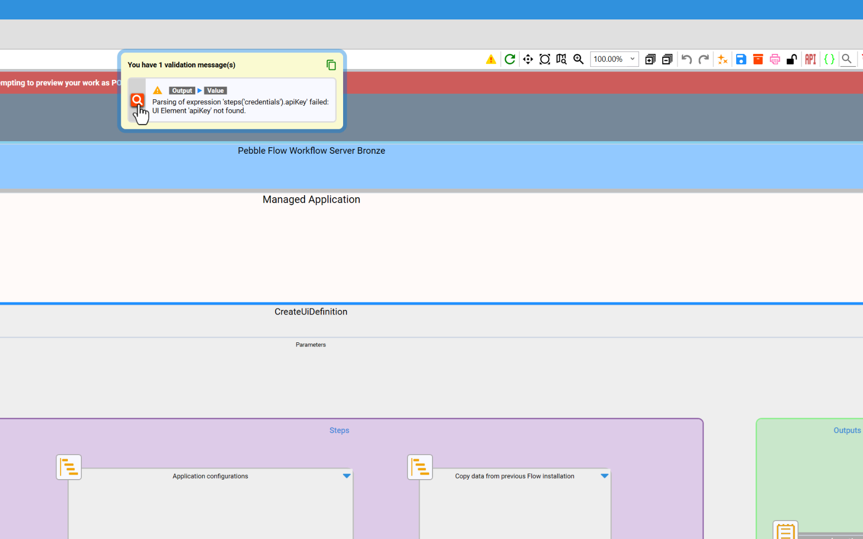 Notice that as soon as we've changed the name, the designer's toolbar displays the warning icon instead of the green check mark. This indicates that the change—the refactoring—introduced a breaking change in the createUiDefinition, most likely in an expression that was referencing the control by its name in order to retrieve its value.