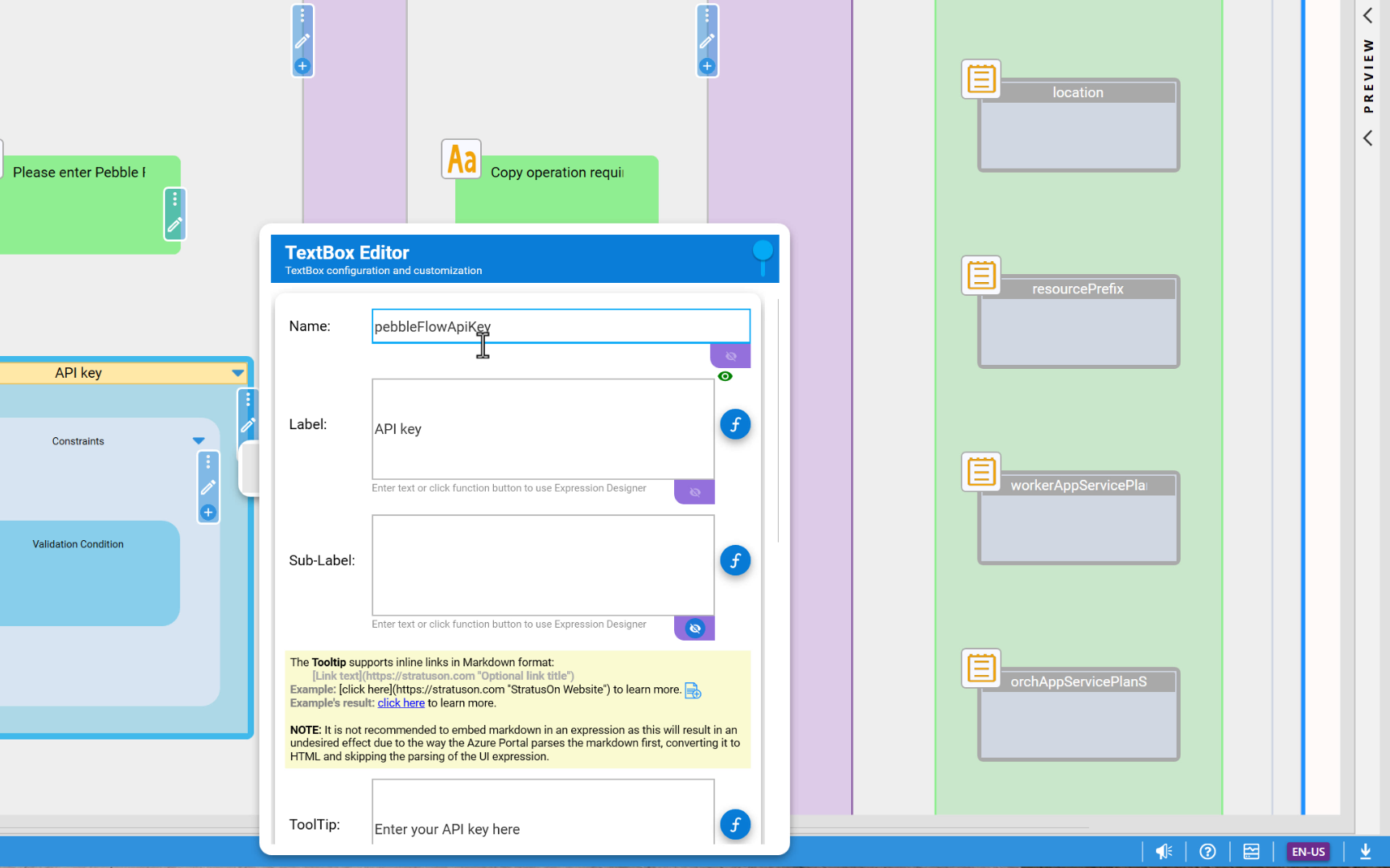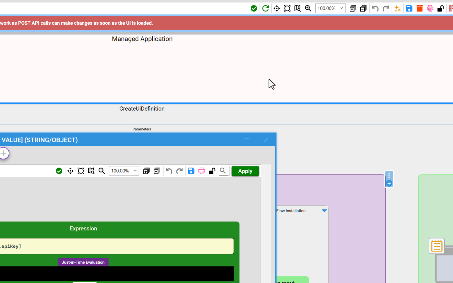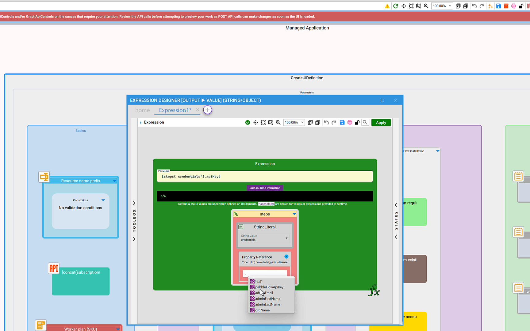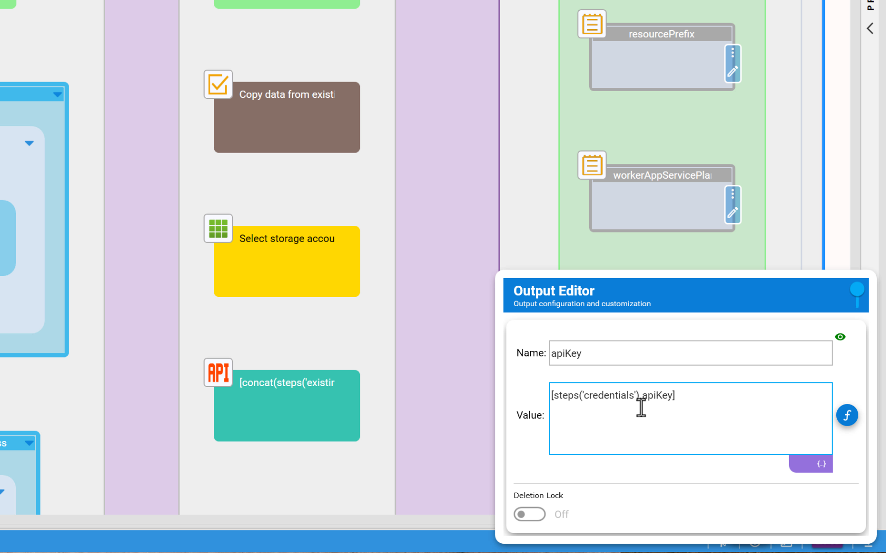 Upon opening the Output parameter editor, we can see that the expression specified in the Value property is referencing the old name of the control, apiKey, inside the credentials step. We can change it manually to the new control name, but this is error prone.