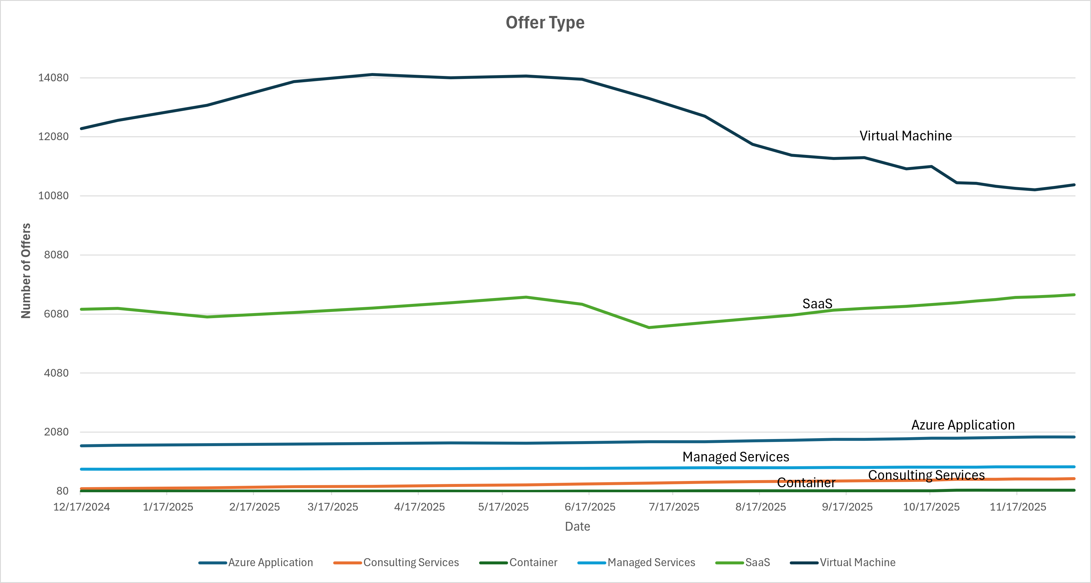 This graph shows the growth (and decline) of offers over time, based on the number of non-private offers published on the Azure Marketplace.