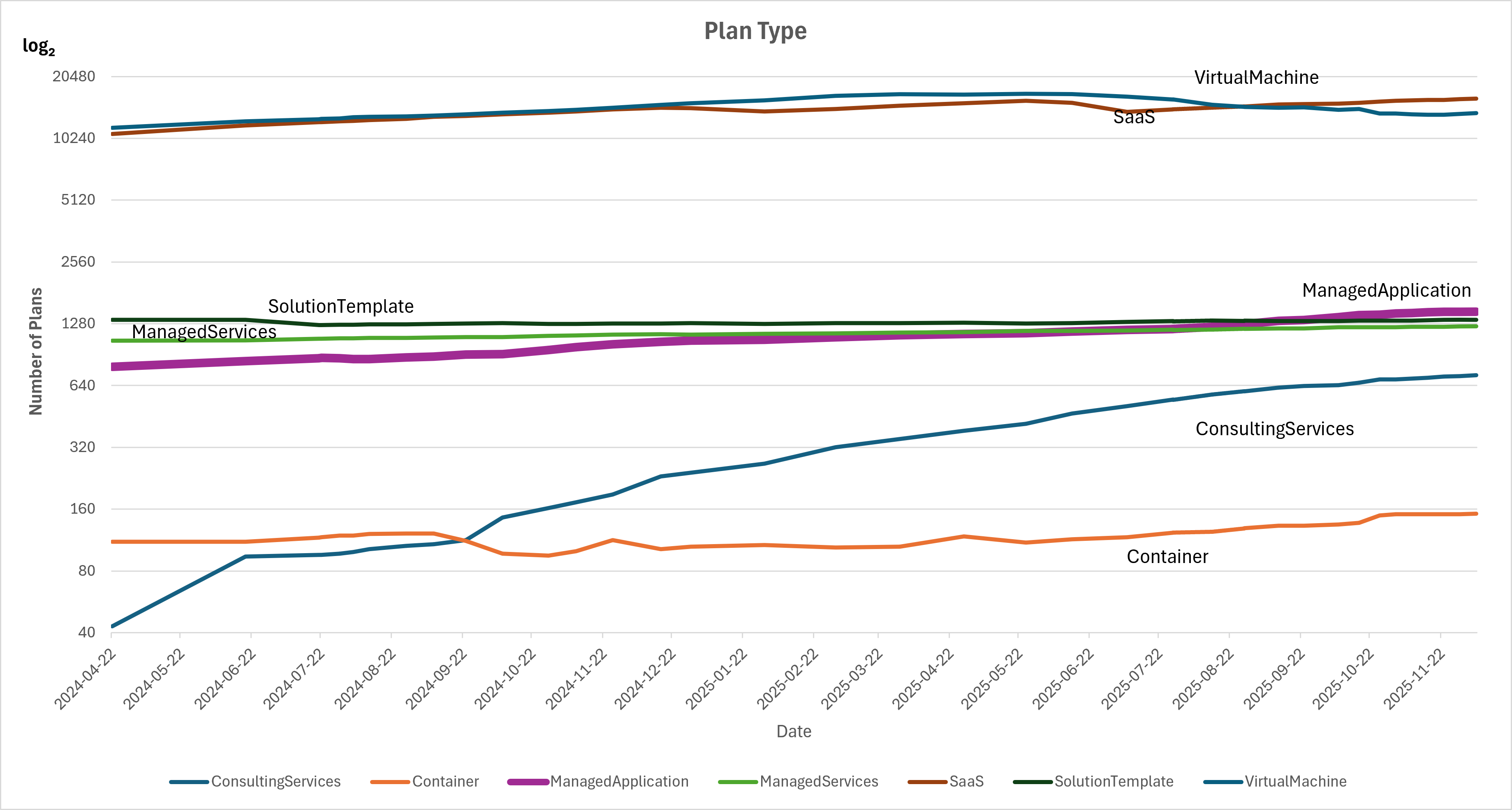 Consulting Services have been steadily increasing over time. While all other offer types have had increases over time, the leader—the Virtual Machine offer type—seems to be losing momentum to SaaS. This will become more apparent as we take a look at growth by plan type since offers can have one or more plans, and some offers—like Azure Applications—have more than one plan type. The one key difference is that Virtual Machine are back to their growth path based of this period's data.