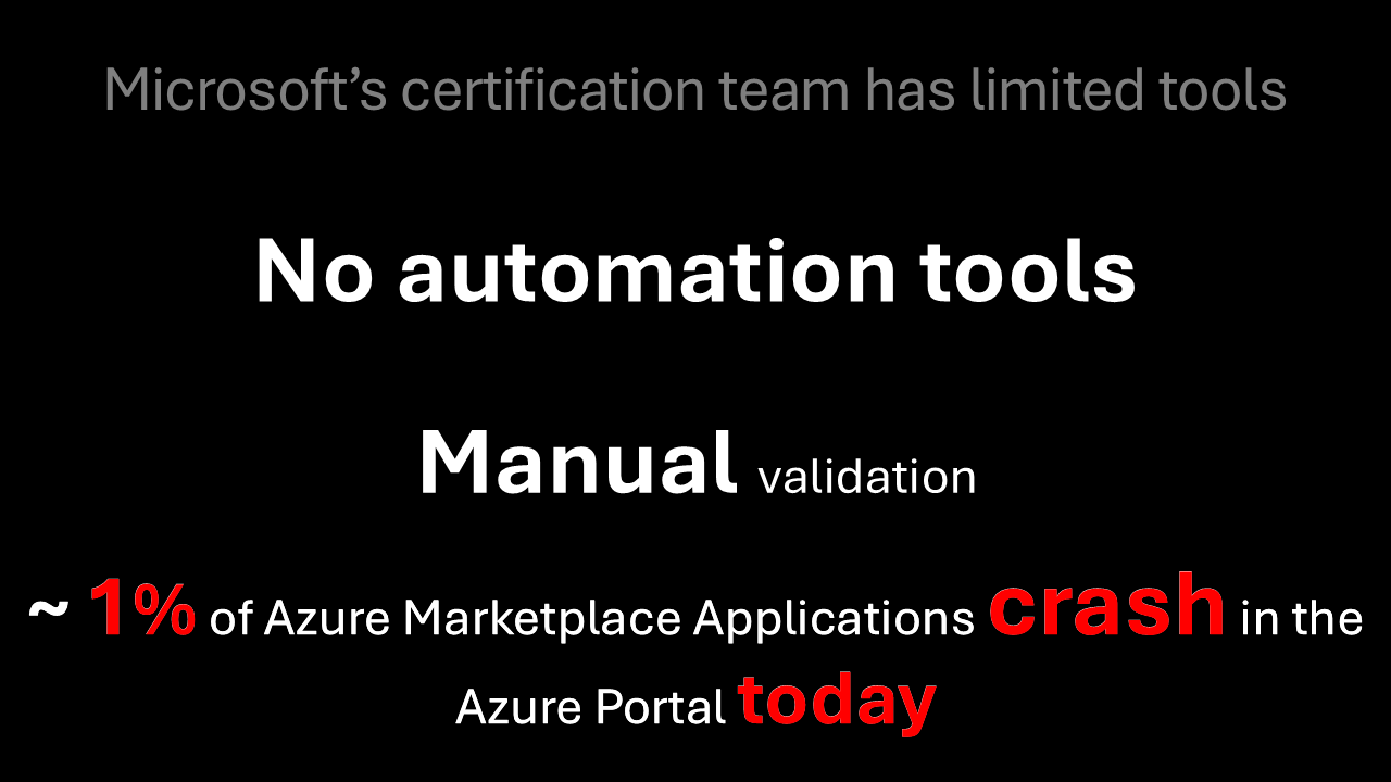 The certification vendor's resources (humans) have limited automated tools. For example, they cannot validate whether the assets constituting a Solution Template or AMA are not broken. They sometimes run the ARM Test Toolkit (arm-ttk), but their use of the tool is not consistent. In addition, that tool only detects best practices violations and malformed JSON, but it cannot validate broken deployment assets or broken UI definitions or ARM templates. As a result of this, there are published Azure Applications today that will blow up when you attempt to load them in the Azure Marketplace UI inside the Azure Portal, due to broken UI definitions (which is what gets loaded and rendered when you pick an offer and plan in the Azure Marketplace UI—the ARM template validation happens only after you've walked through the UI steps and are ready to deploy).