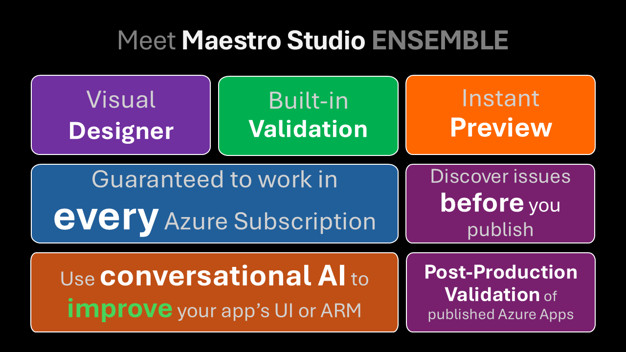 Many Azure Marketplace publishers use Maestro Studio ENSEMBLE in order to ensure they can validate offers and plans before they send them to the Azure Certification Team for approval.