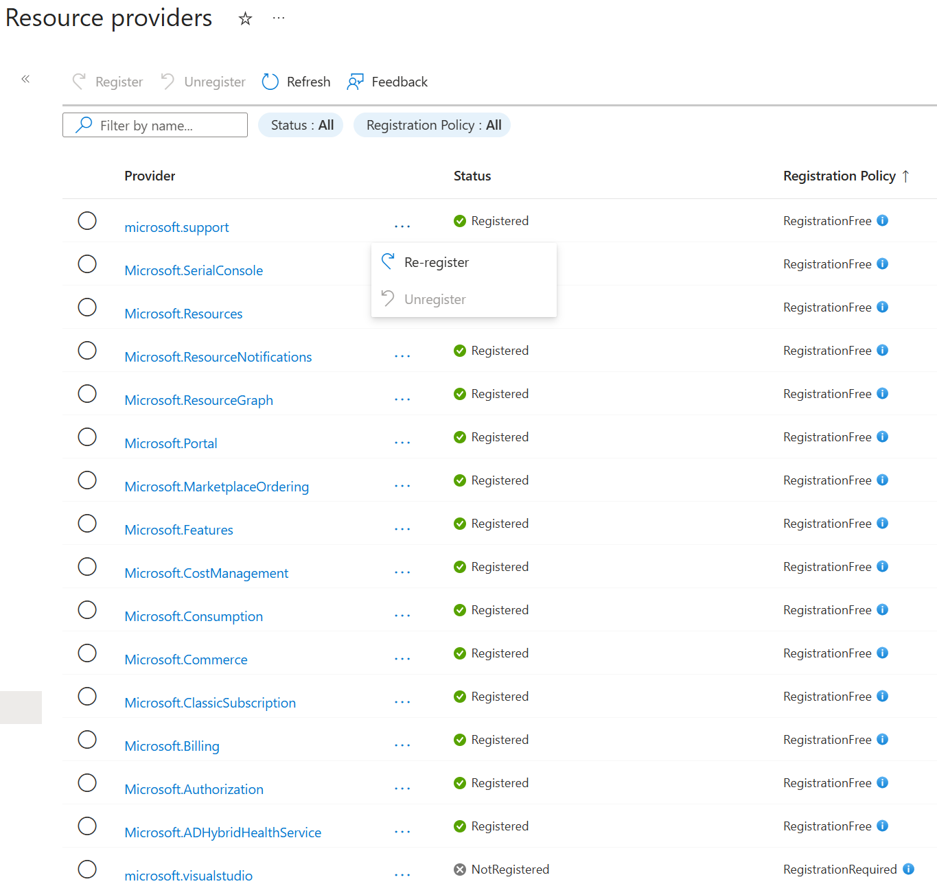 The following screenshot shows the typical list of resource providers that are RegistrationFree. They don't need to be registered. They can be re-registered but cannot be unregistered since some of them are essential for Azure consumption tracking and billing management.